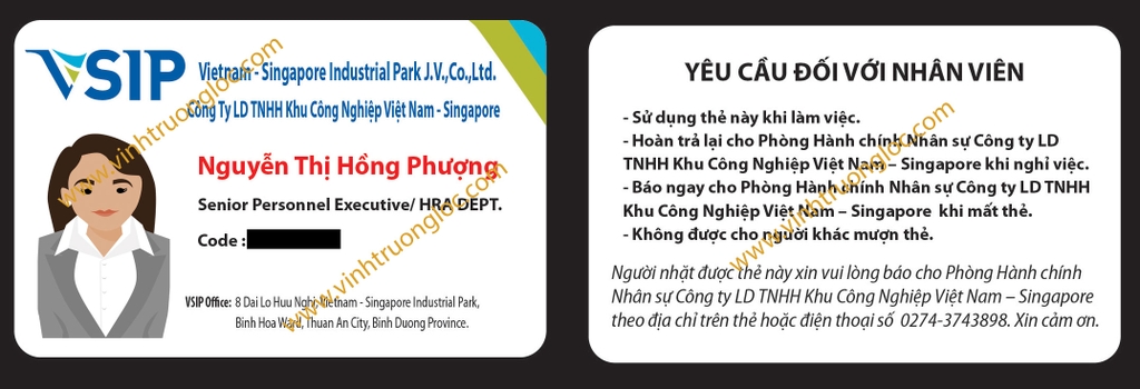 In thẻ nhân viên bằng nhựa giúp cho việc chấm công và quản lý nhân sự được thuận tiện và dễ dàng. Ngoài ra, sử dụng thẻ nhân viên giúp giảm được một khoản chi phí đáng kể trong việc quản lý nhân viên. Thẻ nhân viên thông thường có kích thước là chuẩn thẻ ATM (ISO 86mm x 54mm x 0.76mm). Gồm 2 mẫu: thẻ ngang và thẻ dọc.